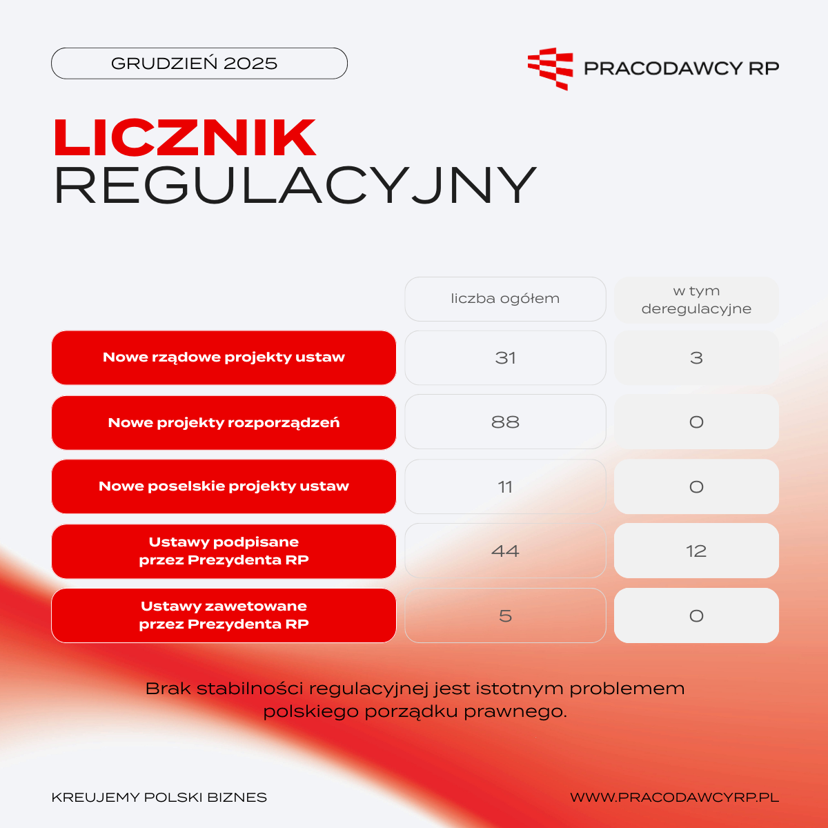 Pracodawcy RP od lat sygnalizują, że brak stabilności regulacyjnej jest istotnym problemem polskiego porządku prawnego. Zjawisko to wpływa na całość systemu, w tym na kwestie wymagające szczególnej uważności ze strony decydentów – sektor zdrowia, bezpieczeństwo publiczne, czy ceny energii. Częste zmiany legislacyjne skutkuje niepewnością co do ich sytuacji prawej jednostki. W sposób jasny rodzi to także obawy co do zakładania i prowadzenia działalności gospodarczej. Jest to także obciążenie dla polskiej administracji. Pracownicy sektora publicznego zamiast korzystać z nabytych kompetencji i wiedzy, muszą dostosowywać się do kolejnych modyfikacji przepisów, co rodzi dodatkowe koszty dla państwa oraz pogłębia problem przewlekłości procedur.